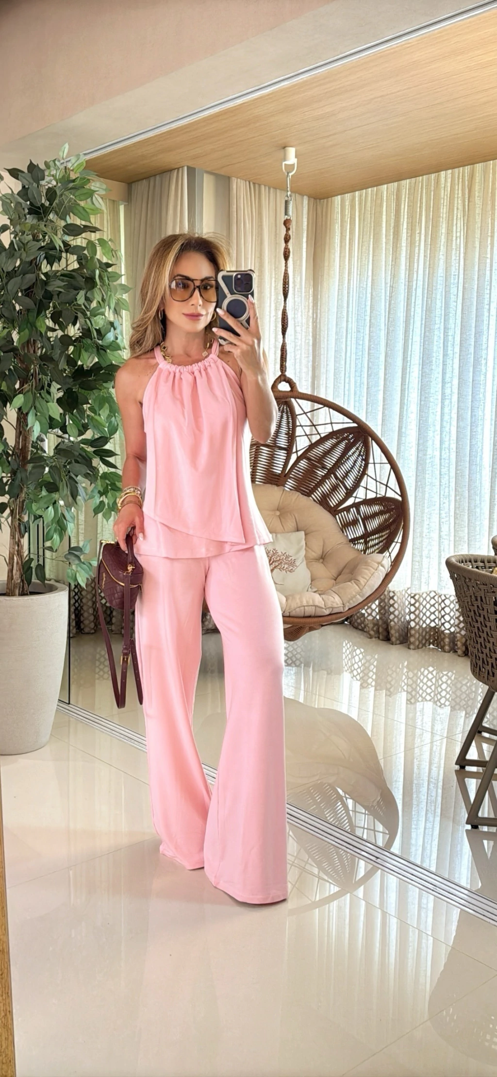 O tom rosa e os detalhes atemporais fazem deste conjunto uma peça-chave do guarda-roupa, perfeita para compor looks que vão do casual ao sofisticado com facilidade.
