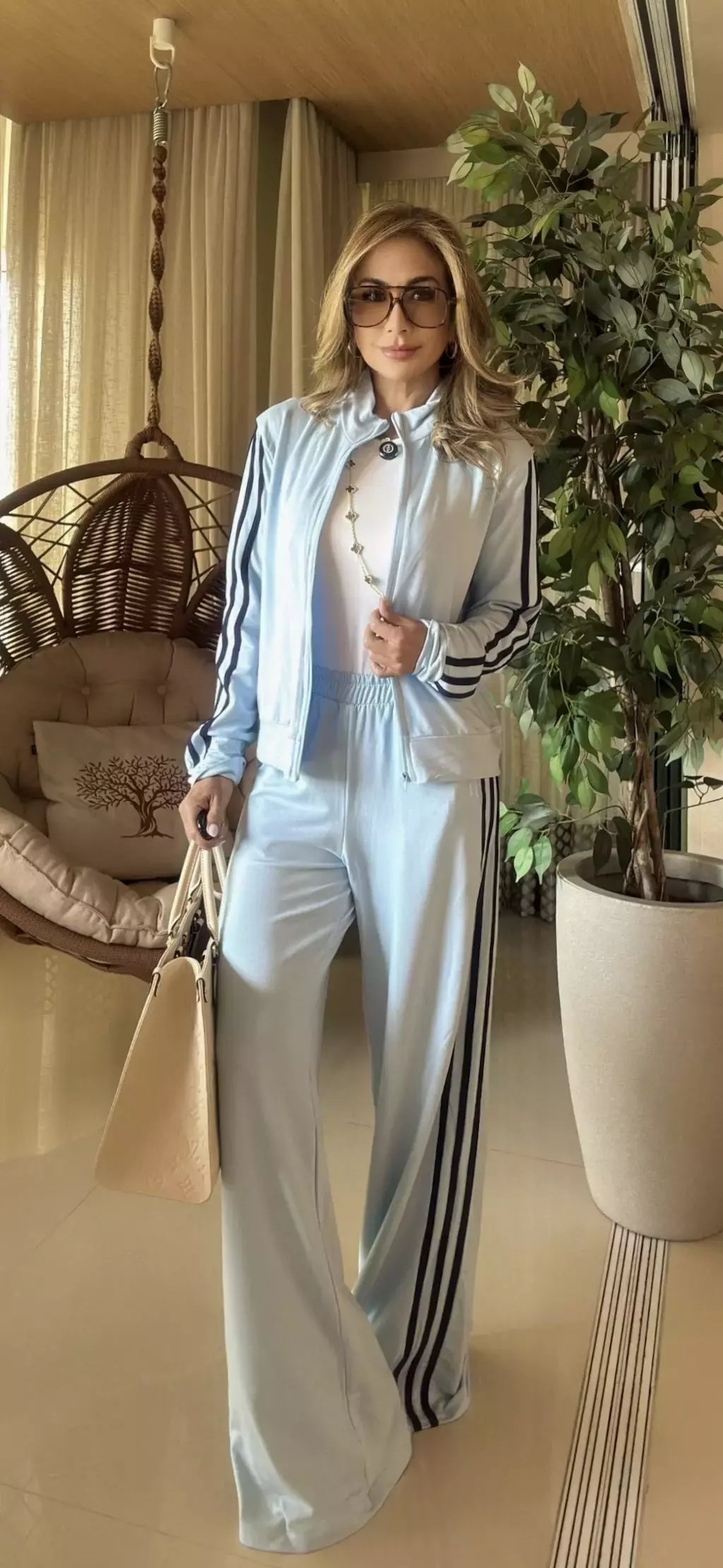 Use o conjunto completo com um tênis minimalista em couro branco ou off-white e uma bolsa tote estruturada.