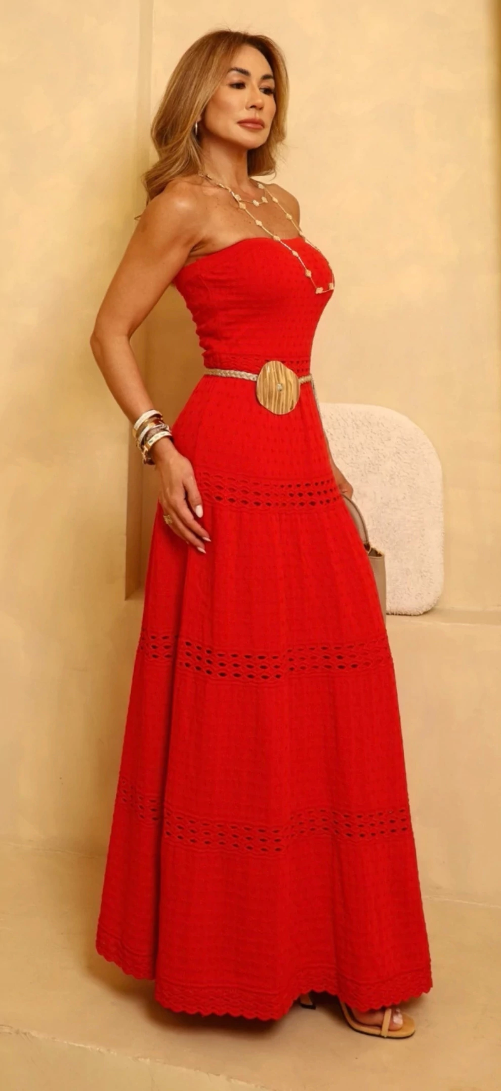 O Vestido Atenas está disponível nas cores Vermelho e Ouro. Para visualizar todas as variações, digite “Vestido Atenas” na barra de pesquisa no topo do site.
